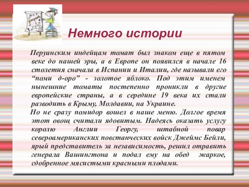 Но не сразу помидор вошел в наше меню. Долгое время этот овощ считали ядовитым. Надеясь оказать услугу королю Англии Георгу, штабной повар североамериканских повстанческих войск Джеймс Бейли, ярый представитель за независимость, решил отравить генерала Вашингтона и подал ему на обед жаркое, сдобренное мясистыми красными плодами.