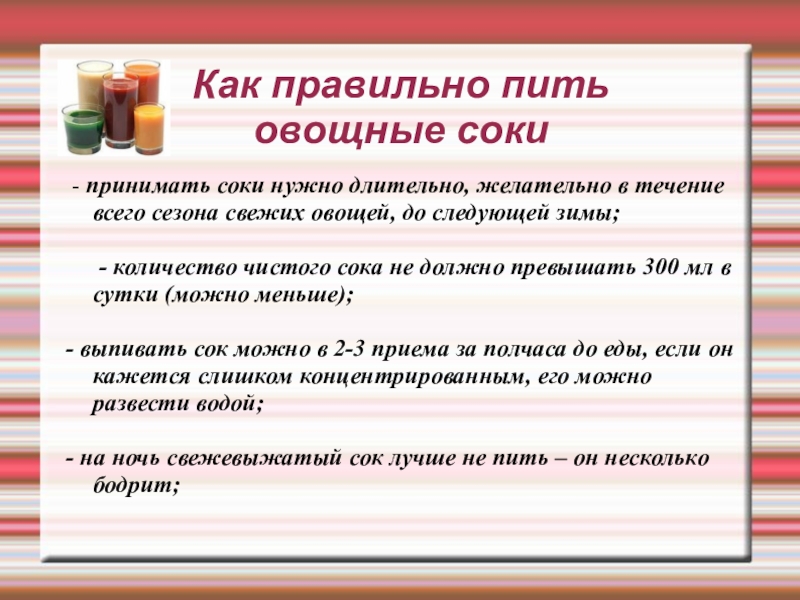 - на ночь свежевыжатый сок лучше не пить – он несколько бодрит;