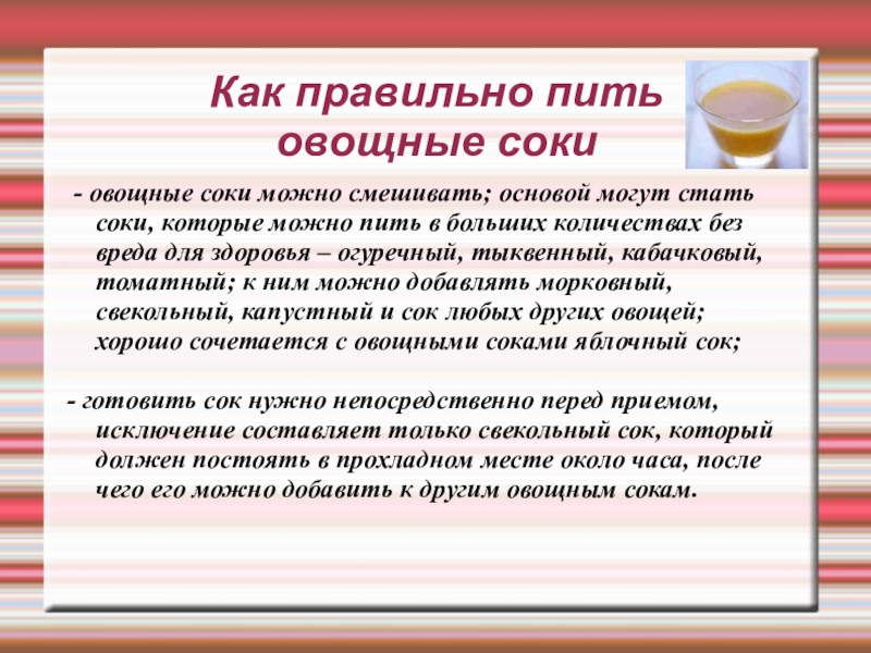 - готовить сок нужно непосредственно перед приемом, исключение составляет только свекольный сок, который должен постоять в прохладном месте около часа, после чего его можно добавить к другим овощным сокам.
