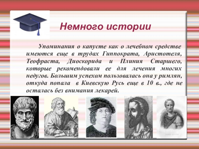 как о лечебном средстве имеются еще в трудах Гиппократа, Аристотеля, Теофраста, Диоскорида и Плиния Старшего, которые рекомендовали ее для лечения многих недугов. Большим успехом пользовалась она у римлян, откуда попала в Киевскую Русь еще в 10 в., где не осталась без внимания лекарей.
