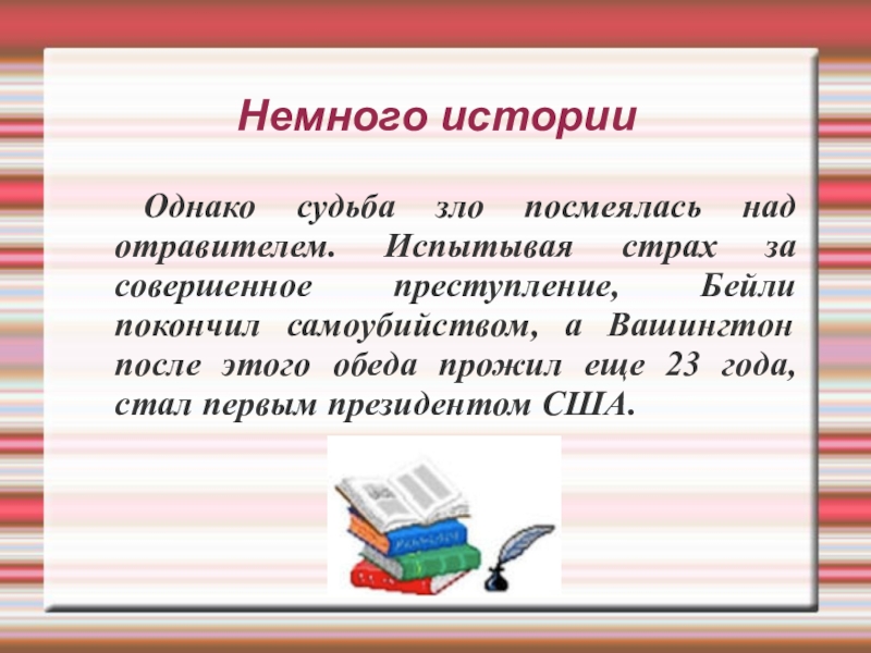 совершенное преступление, Бейли покончил самоубийством, а Вашингтон после этого обеда прожил еще 23 года, стал первым президентом США.