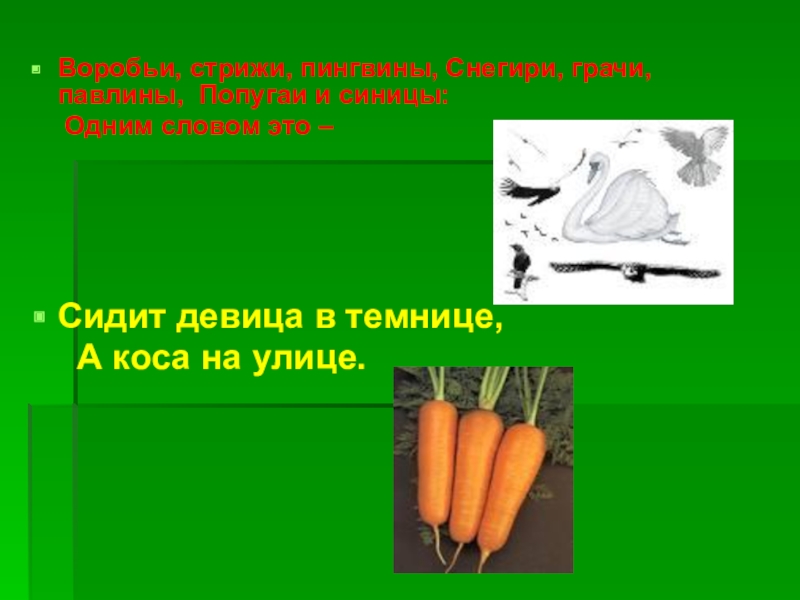 Воробьи, стрижи, пингвины, Снегири, грачи, павлины, Попугаи и синицы:
