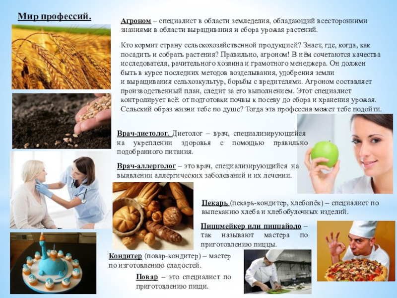 Кто кормит страну сельскохозяйственной продукцией? Знает, где, когда, как посадить и собрать растения? Правильно, агроном! В нём сочетаются качества исследователя, рачительного хозяина и грамотного менеджера. Он должен быть в курсе последних методов возделывания, удобрения земли и выращивания сельхозкультур, борьбы с вредителями. Агроном составляет производственный план, следит за его выполнением. Этот специалист контролирует всё: от подготовки почвы к посеву до сбора и хранения урожая. Сельский образ жизни тебе по душе? Тогда эта профессия может тебе подойти.