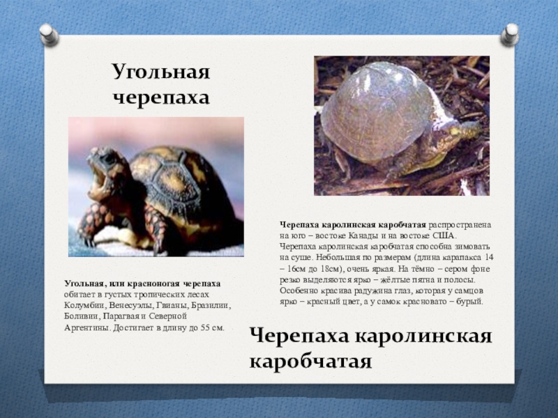 Черепаха каролинская каробчатая распространена на юго – востоке Канады и на востоке США. Черепаха каролинская каробчатая способна зимовать на суше. Небольшая по размерам (длина карапакса 14 – 16см до 18см), очень яркая. На тёмно – сером фоне резко выделяются ярко – жёлтые пятна и полосы. Особенно красива радужина глаз, которая у самцов ярко – красный цвет, а у самок красновато – бурый.