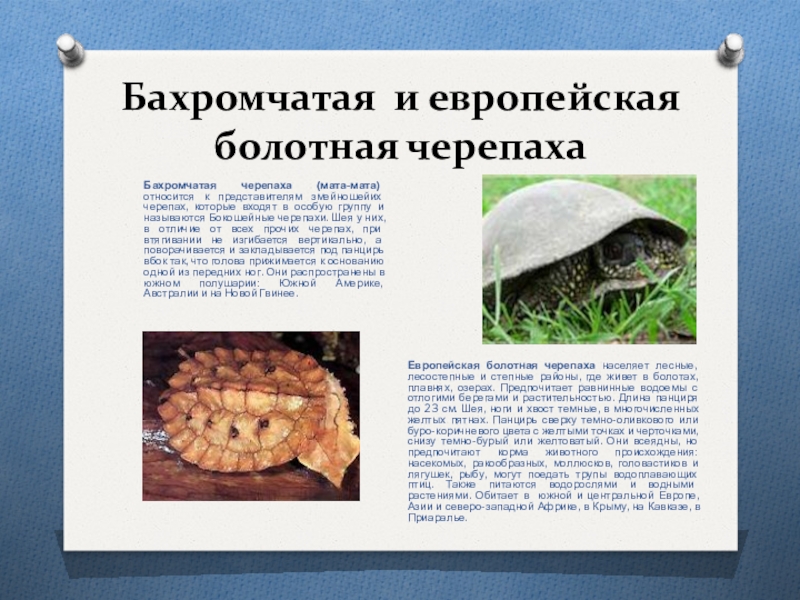Европейская болотная черепаха населяет лесные, лесостепные и степные районы, где живет в болотах, плавнях, озерах. Предпочитает равнинные водоемы с отлогими берегами и растительностью. Длина панциря до 23 см. Шея, ноги и хвост темные, в многочисленных желтых пятнах. Панцирь сверху темно-оливкового или буро-коричневого цвета с желтыми точках и черточками, снизу темно-бурый или желтоватый. Они всеядны, но предпочитают корма животного происхождения: насекомых, ракообразных, моллюсков, головастиков и лягушек, рыбу, могут поедать трупы водоплавающих птиц. Также питаются водорослями и водными растениями. Обитает в южной и центральной Европе, Азии и северо-западной Африке, в Крыму, на Кавказе, в Приаралье.