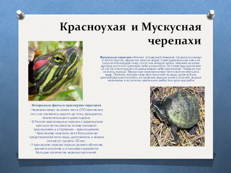 Мускусные черепахи обитают в Северной Америке. На воле они живут в почти стоячих, медленно текучих водах. Своё удивительное имя они получили благодаря тому, что от них исходит запах, похожий на запах мускуса, если они чувствуют себя в опасности. Эти черепахи достигают 12 см. На илистом дне они разыскивают себе пропитание. Плавают они не очень хорошо. Мускусные черепахи живут почти исключительно в воде. Питание, которое черепахи получают из воды, должно быть разнообразным и состоять из червяков, водных улиток, слизней, водных насекомых и их личинок, маленьких рыбок или кусочков рыбы