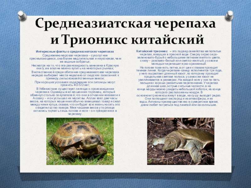 На голове тоже есть пятна, а от шеи к глазам проходит темная линия. Когда черепахе-самцу исполняется три года, у него вырастает длинный хвост, по которому проходит продольная светлая полоса, у самок же хвост не увеличивается в размерах. На каждой ноге у них по пять пальцев с хорошо развитыми перепонками. У черепах длинная шея, острые сильные челюсти, а на конце морды можно увидеть небольшой хоботок, на конце которого расположены ноздри. В основном триониксы живут в воде, на сушу выходят редко. Они поглощают кислород и из атмосферы, и из воды. Активны преимущественно в сумеречное время, днем любят погреться под лампой или на солнышке.