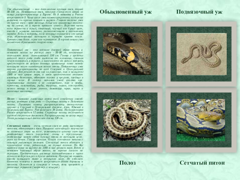 Неядовитая змея, которая счита-ется одной из самых распространенных в Европе. Из 9 подвидов в России встречаются 3. Чаще всего ужа можно встретить на берегах водоемов, он хорошо плавает и ныряет. Главное отличие ужа от прочих змей – ярко желтые, белые или оранжевые отмети-ны на голове, их в народе прозвали «ушки». Верх-няя часть тела окрашена в серый, оливковый, чер-ный или бурый цвет, иногда с черными пятнами, расположенными в шахматном порядке. Есть и под-виды, тело которых окрашено в сетчатый узор, обра-зованный светлыми и черными краями чешуи. Брюшко ужа белое, серое или черноватое. В период линьки ужи полностью сбрасывают старую кожу.