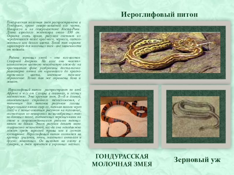 Полоз - название различных видов змей семейства ужеоб-разных, входящих в два рода — Стройные полозы и Лаза-ющие полозы. Лазающие полозы распространены доста-точно широко: в Северной и Центральной Америке, Азии, Южной и Централь-ной Европе. Род включает 36 видов. На территории России встречается 12 видов. Стройные полозы отличаются высокой скоростью движения. Распространены по всему миру. Полоз разноцветный достигает длины 130 см.