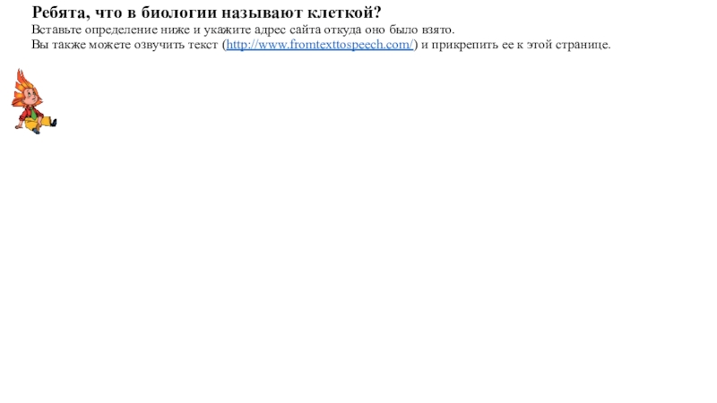 Ребята, что в биологии называют клеткой? Вставьте определение ниже и укажите адрес сайта откуда оно было взято. Вы также можете озвучить текст (http://www.fromtexttospeech.com/) и прикрепить ее к этой странице.