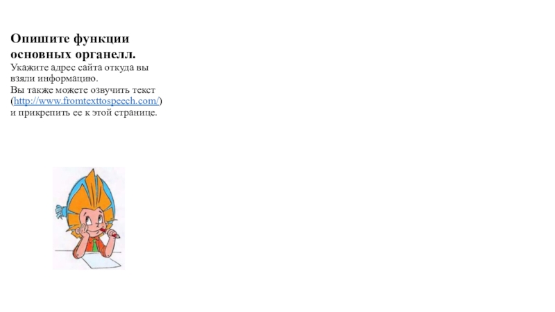 Слайд 5Опишите функции основных органелл. Укажите адрес сайта откуда вы взяли информацию. Вы