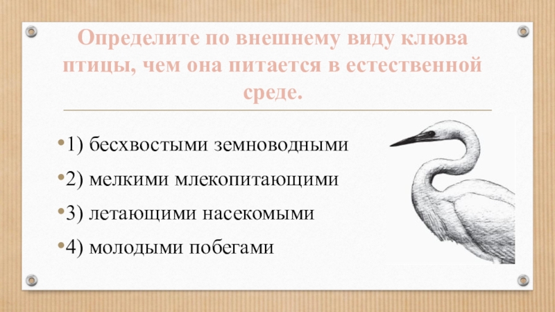 Определите по внешнему виду клюва птицы, чем она питается в естественной среде.