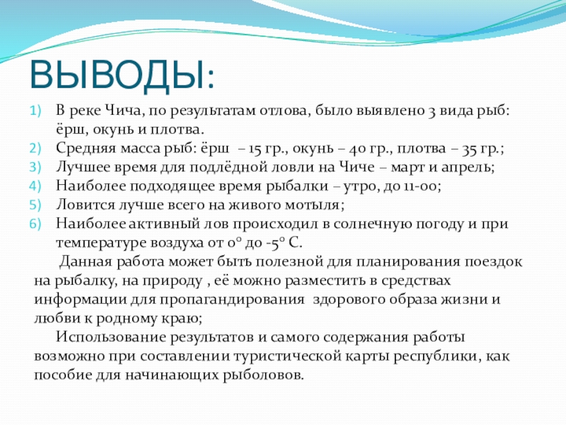 Использование результатов и самого содержания работы возможно при составлении туристической карты республики, как пособие для начинающих рыболовов.