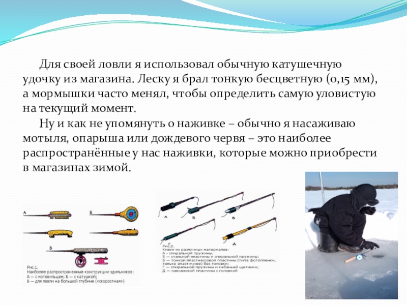 Слайд 6Для своей ловли я использовал обычную катушечную удочку из магазина. Леску