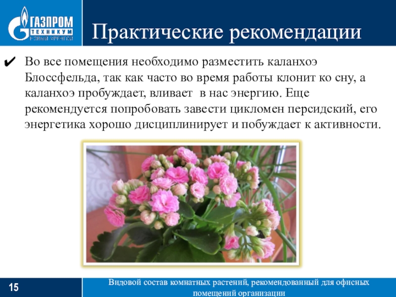 помещения необходимо разместить каланхоэ Блоссфельда, так как часто во время работы клонит ко сну, а каланхоэ пробуждает, вливает в нас энергию. Еще рекомендуется попробовать завести цикломен персидский, его энергетика хорошо дисциплинирует и побуждает к активности.