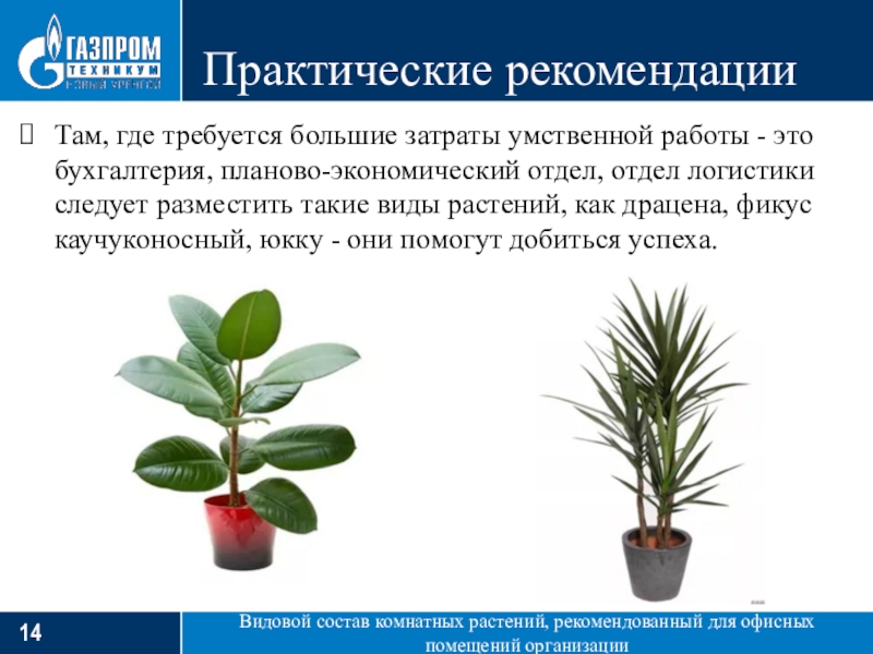 требуется большие затраты умственной работы - это бухгалтерия, планово-экономический отдел, отдел логистики следует разместить такие виды растений, как драцена, фикус каучуконосный, юкку - они помогут добиться успеха.