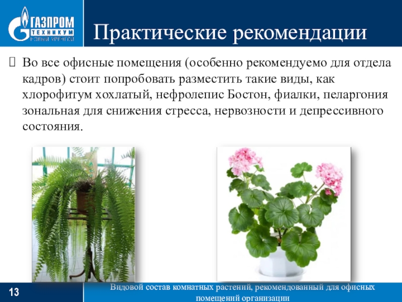 офисные помещения (особенно рекомендуемо для отдела кадров) стоит попробовать разместить такие виды, как хлорофитум хохлатый, нефролепис Бостон, фиалки, пеларгония зональная для снижения стресса, нервозности и депрессивного состояния.