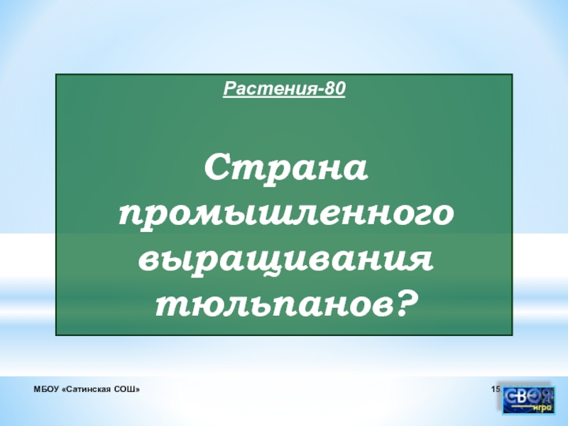 15.05.2016МБОУ «Сатинская СОШ»Растения-80Страна промышленного выращивания тюльпанов?