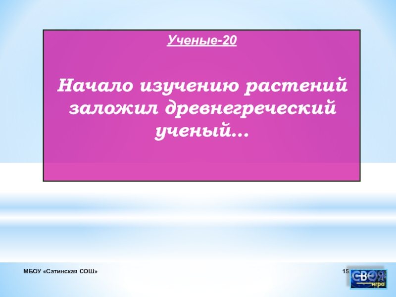 15.05.2016МБОУ «Сатинская СОШ»Ученые-20Начало изучению растений заложил древнегреческий ученый…
