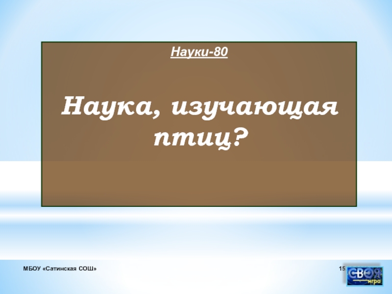 15.05.2016МБОУ «Сатинская СОШ»Науки-80Наука, изучающая птиц?