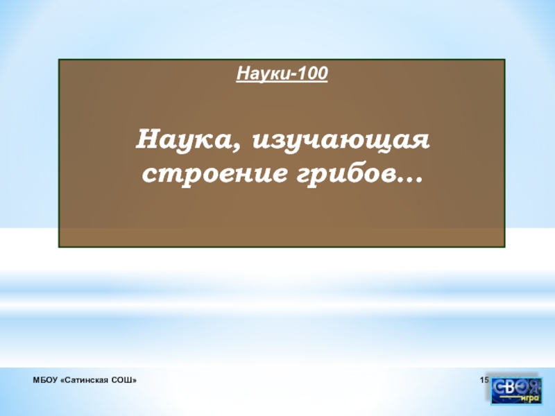 15.05.2016МБОУ «Сатинская СОШ»Науки-100 Наука, изучающая строение грибов...
