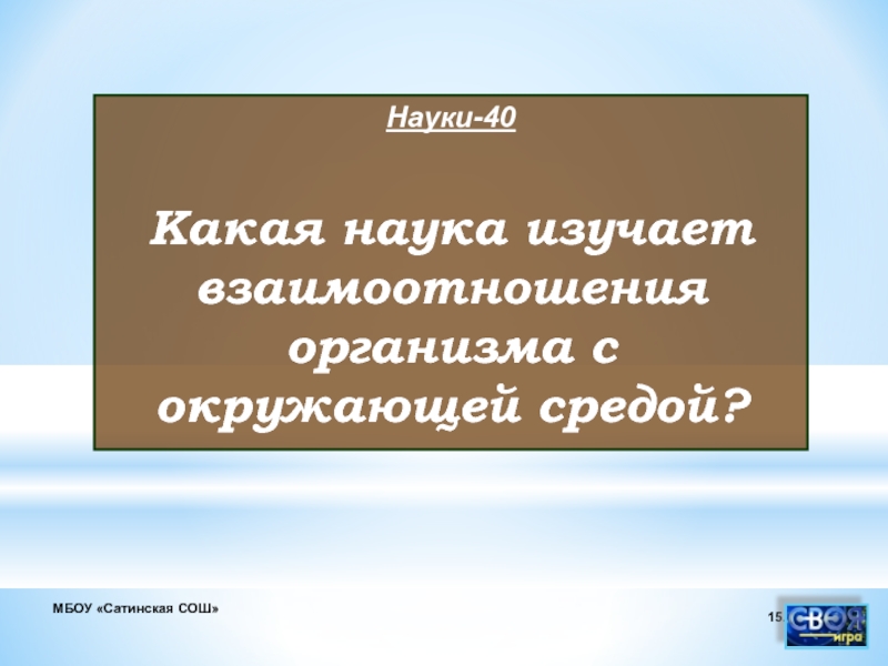 15.05.2016МБОУ «Сатинская СОШ»Науки-40Какая наука изучает взаимоотношения организма с окружающей средой?