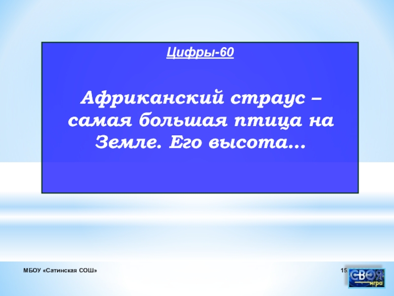 15.05.2016МБОУ «Сатинская СОШ»Цифры-60Африканский страус – самая большая птица на Земле. Его высота…