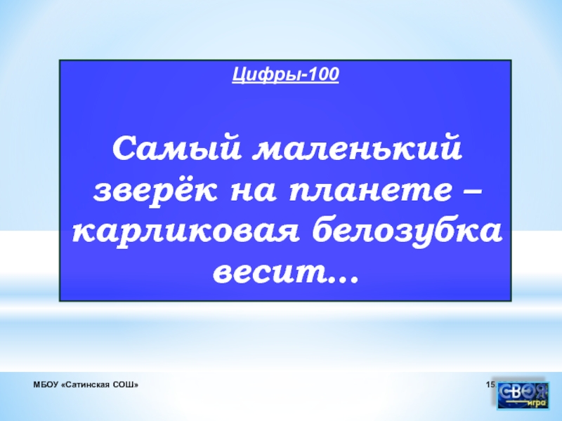15.05.2016МБОУ «Сатинская СОШ»Цифры-100Самый маленький зверёк на планете – карликовая белозубка весит…