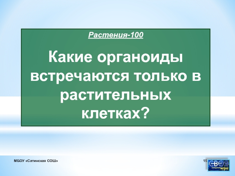 15.05.2016МБОУ «Сатинская СОШ»Растения-100Какие органоиды встречаются только в растительных клетках?