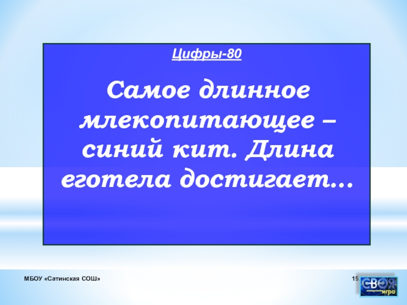 15.05.2016МБОУ «Сатинская СОШ»Цифры-80Самое длинное млекопитающее –синий кит. Длина еготела достигает…