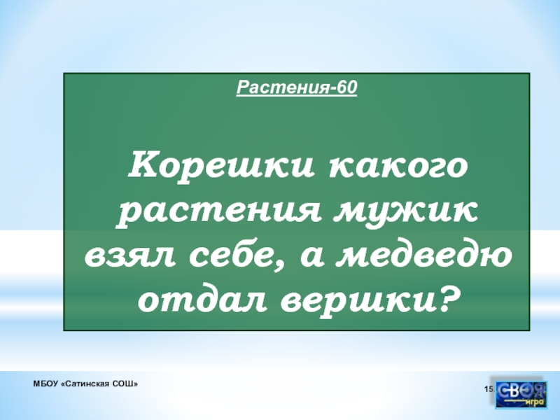15.05.2016МБОУ «Сатинская СОШ»Растения-60Корешки какого растения мужик взял себе, а медведю отдал вершки?