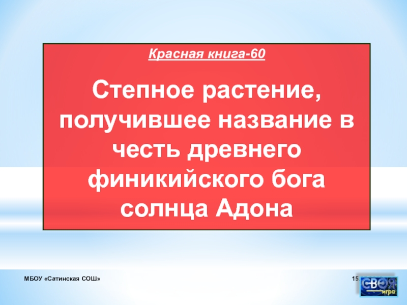 15.05.2016МБОУ «Сатинская СОШ»Красная книга-60Степное растение, получившее название в честь древнего финикийского бога солнца Адона