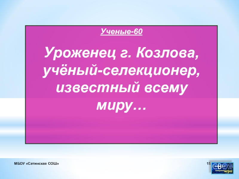 15.05.2016МБОУ «Сатинская СОШ»Ученые-60Уроженец г. Козлова, учёный-селекционер, известный всему миру…