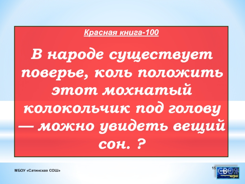 15.05.2016МБОУ «Сатинская СОШ»Красная книга-100В народе существует поверье, коль положить этот мохнатый колокольчик под голову — можно увидеть