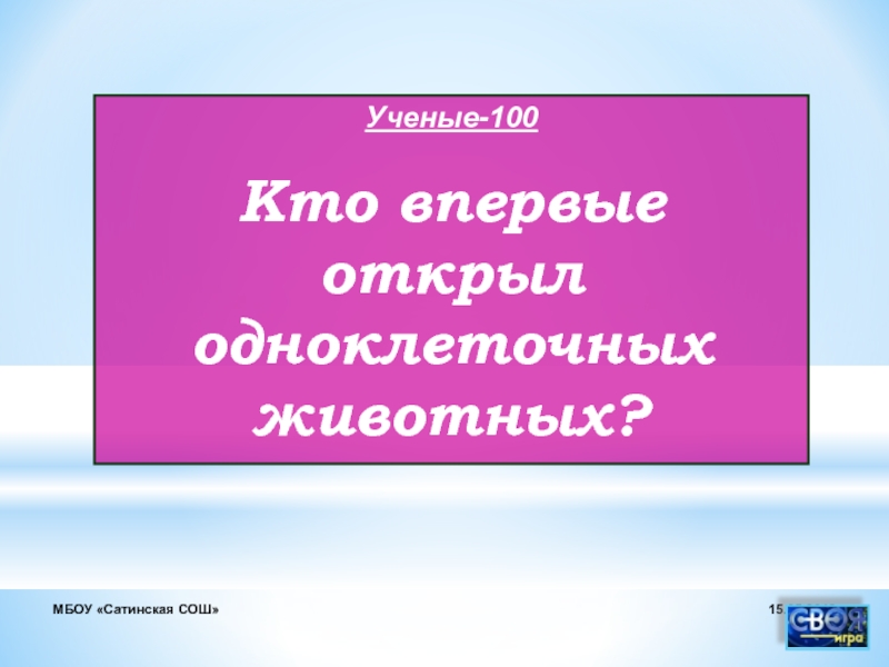 15.05.2016МБОУ «Сатинская СОШ»Ученые-100Кто впервые открыл одноклеточных животных?