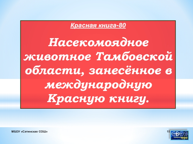 15.05.2016МБОУ «Сатинская СОШ»Красная книга-80Насекомоядное животное Тамбовской области, занесённое в международную Красную книгу.
