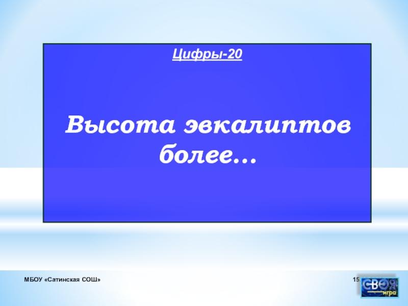 15.05.2016МБОУ «Сатинская СОШ»Цифры-20Высота эвкалиптов более...