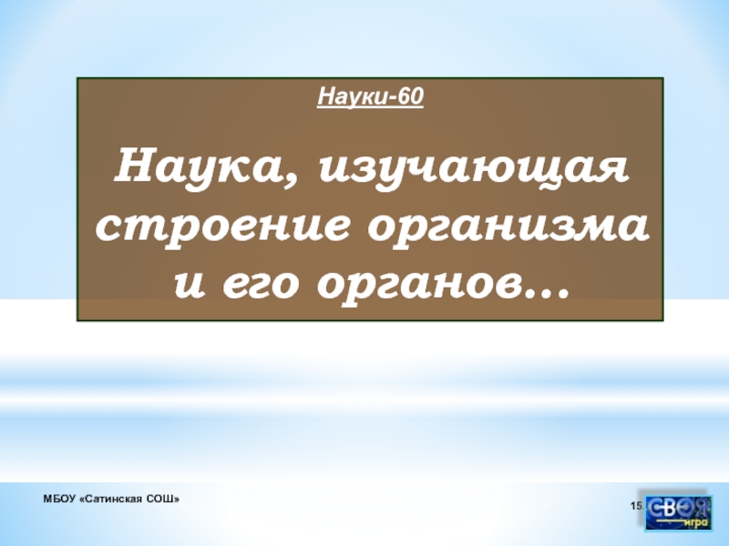15.05.2016МБОУ «Сатинская СОШ»Науки-60Наука, изучающая строение организма и его органов...