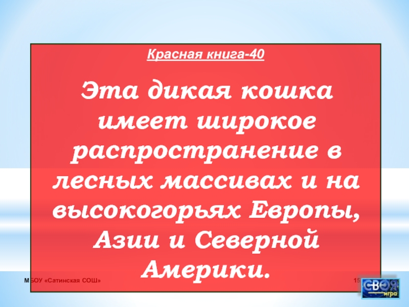 15.05.2016МБОУ «Сатинская СОШ»Красная книга-40Эта дикая кошка имеет широкое распространение в лесных массивах и на высокогорьях Европы, Азии
