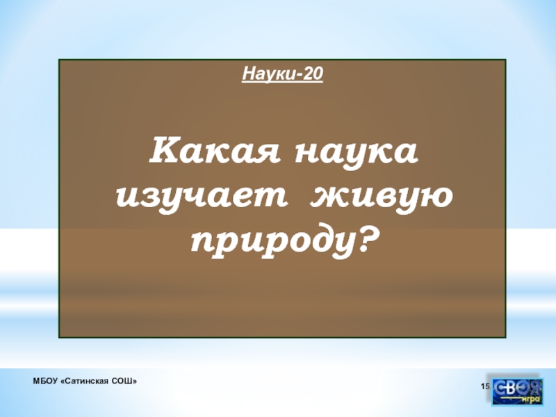 15.05.2016МБОУ «Сатинская СОШ»Науки-20Какая наука изучает живую природу?