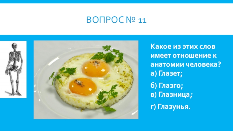 Вопрос № 11Какое из этих слов имеет отношение к анатомии человека? а) Глазет;б) Глазго; в) Глазница;г) Глазунья.
