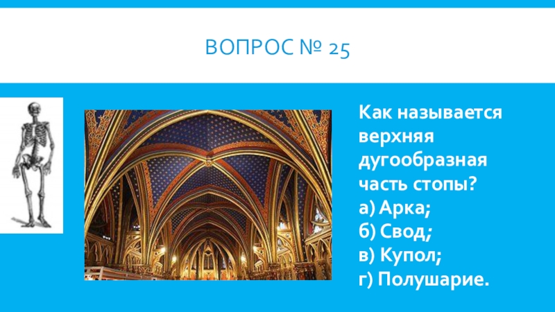Вопрос № 25Как называется верхняя дугообразная часть стопы? а) Арка; б) Свод; в) Купол; г) Полушарие.