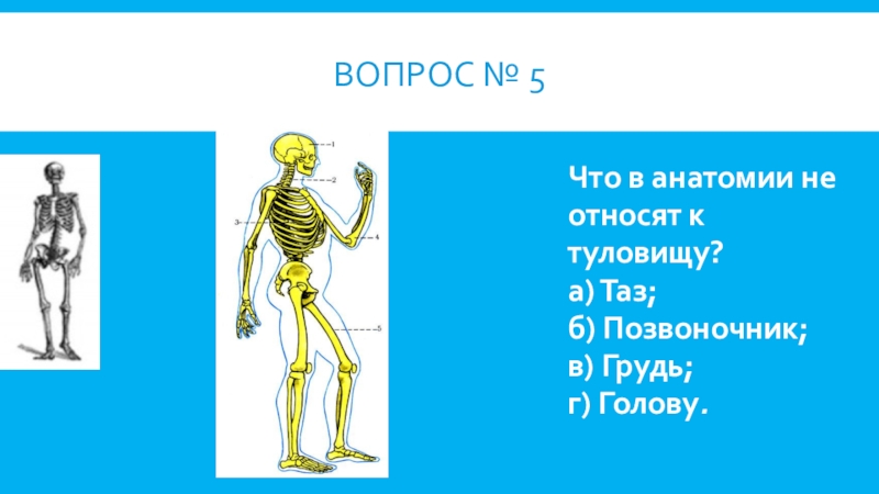 Вопрос № 5Что в анатомии не относят к туловищу? а) Таз; б) Позвоночник; в) Грудь; г) Голову.