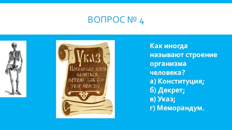 Вопрос № 4Как иногда называют строение организма человека? а) Конституция; б) Декрет; в) Указ; г) Меморандум.