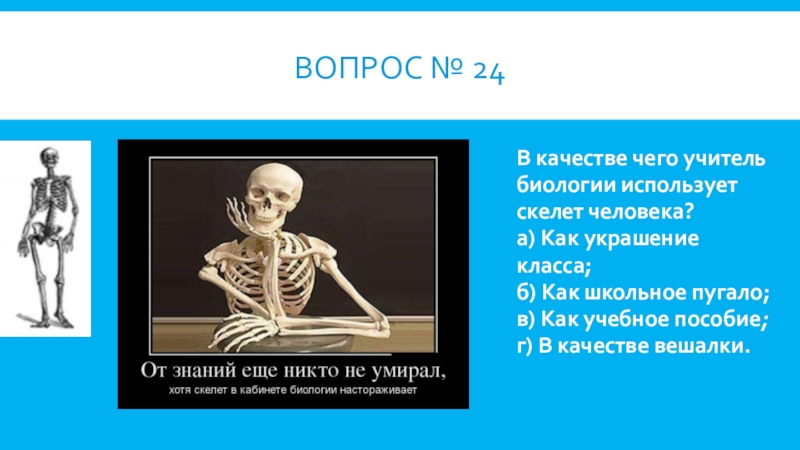 Вопрос № 24В качестве чего учитель биологии использует скелет человека? а) Как украшение класса; б) Как школьное