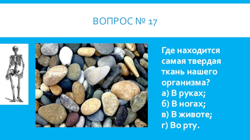 Вопрос № 17Где находится самая твердая ткань нашего организма? а) В руках; б) В ногах; в) В