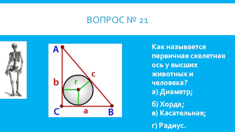 Вопрос № 21Как называется первичная скелетная ось у высших животных и человека? а) Диаметр;б) Хорда; в) Касательная;г)