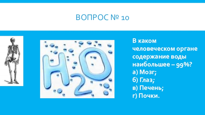 Вопрос № 10В каком человеческом органе содержание воды наибольшее – 99%? а) Мозг; б) Глаз; в) Печень;