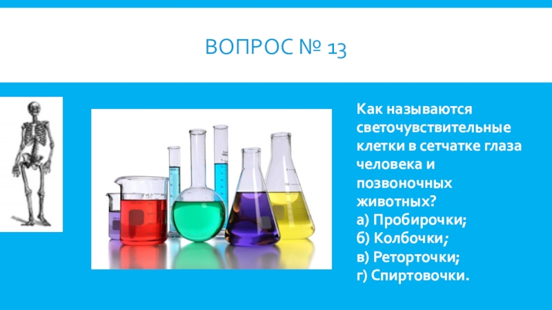 Вопрос № 13Как называются светочувствительные клетки в сетчатке глаза человека и позвоночных животных? а) Пробирочки; б) Колбочки;