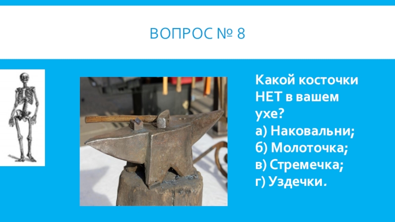 Вопрос № 8Какой косточки НЕТ в вашем ухе? а) Наковальни; б) Молоточка; в) Стремечка; г) Уздечки.